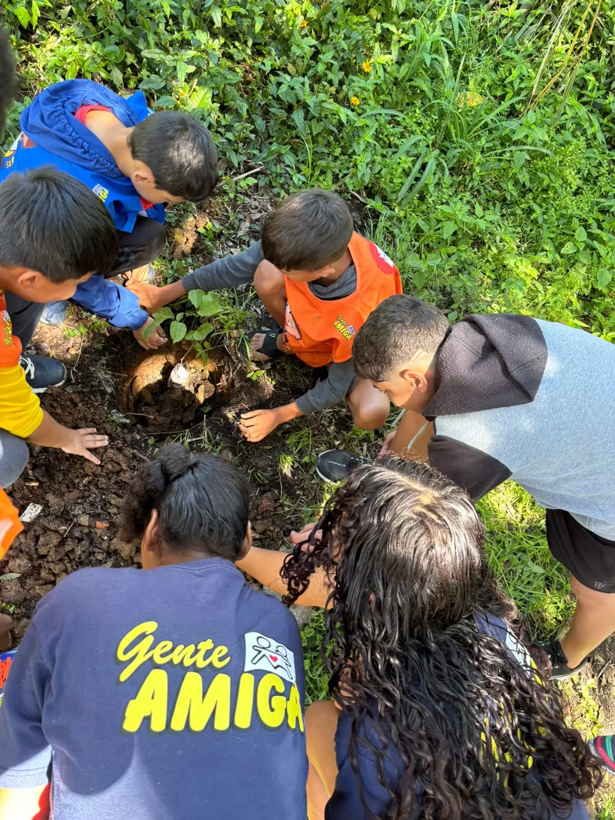 A programação incluiu também contação de histórias e uma conversa sobre o plantio, explicando a importância das árvores, os benefícios de cada espécie e os cuidados necessários para o seu crescimento. Os grupos participaram do plantio de mudas frutíferas, incluindo pitangas, ipês roxos e amarelos, laranjinhas, guabirobas e chal-chal, além de diversas hortaliças e temperos destinados à horta comunitária.