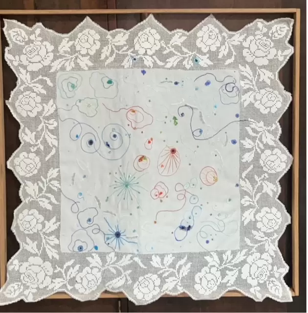 Miriam Porto volta a mexer com as memórias com “Toalha da Vó Maria”, um bordado em linha e pedraria, utilizando o ponto “smirna” em tapeçaria para redesenhar seus ícones. “Optei em utilizar uma antiga toalha de família, bordada com ponto “ajour” e em linha mercê crochê, que foi perfurada pelo tempo. Nela foram agregados pedrarias e símbolos do mar, como invocação da natureza, que também tem sido objeto de desgaste, não do tempo, mas da ação humana.