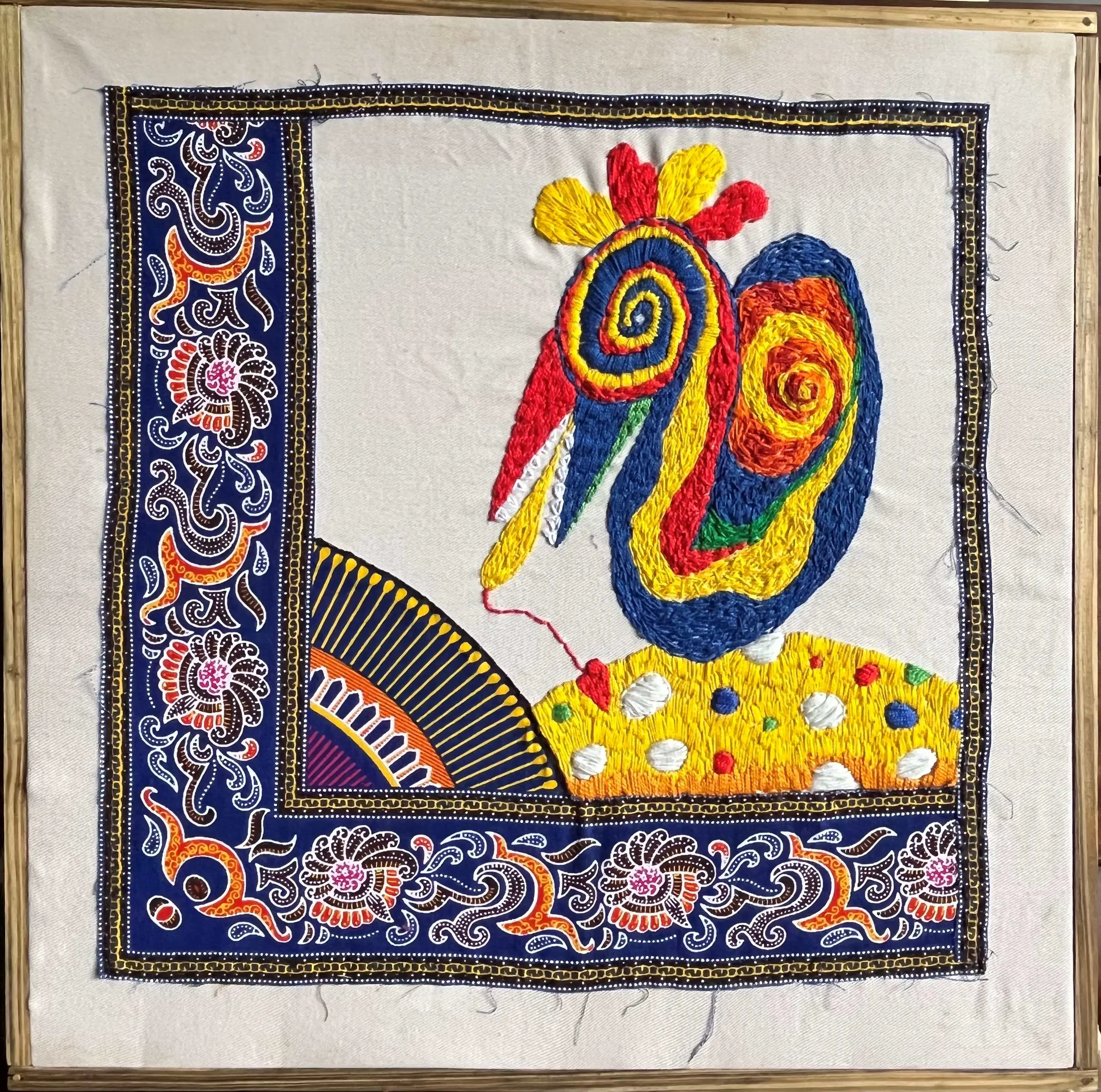 No bordado em homenagem a Vera, um pássaro em azul traz cores que destoam de seu legado. “Escolhi cores primárias para dialogar com a Eli, cujo pássaro remete ao seu Mundo Ovo. Esse pássaro foi por ela desenhado na dedicatória do seu livro, ‘Vomitando os Sentimentos’, que repousa na estante de meu atelier”, conta.
