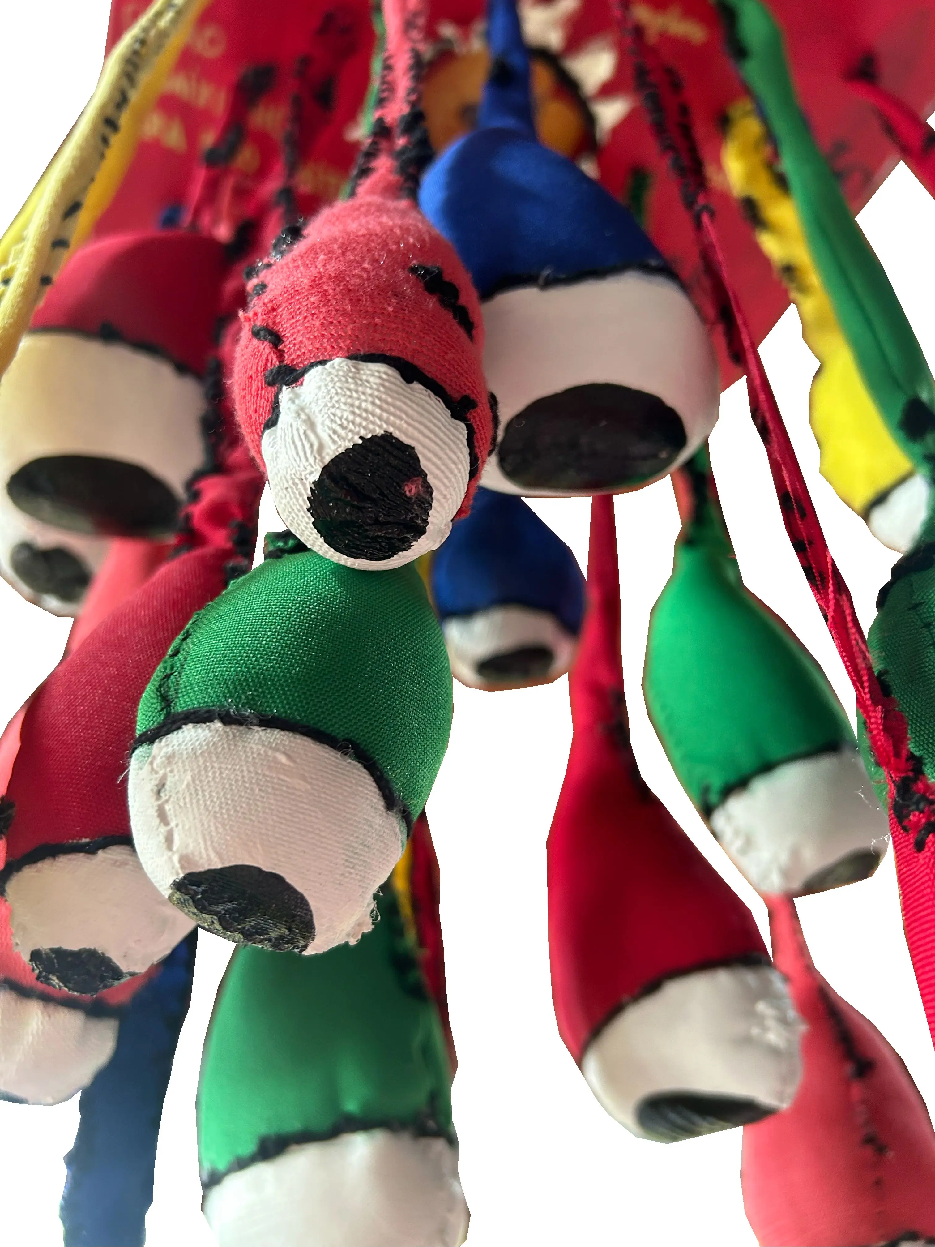 “Penso em Eli e em seu Adão e Eva, que guardavam o portal Mundo Ovo. Quando a estrada avançou e o governo demoliu as esculturas, Eli recolheu os fragmentos, pintou-os de vermelho e transformou os destroços em um cemitério de Adão e Eva. Onde havia Adão e Eva, há agora Adão e Ivo, abrindo passagem para um modo de estar junto, um nascimento sem culpa. A cortina de fuxicos pende como corpo têxtil, em que cada retalho guarda a memória de um toque”, explica.