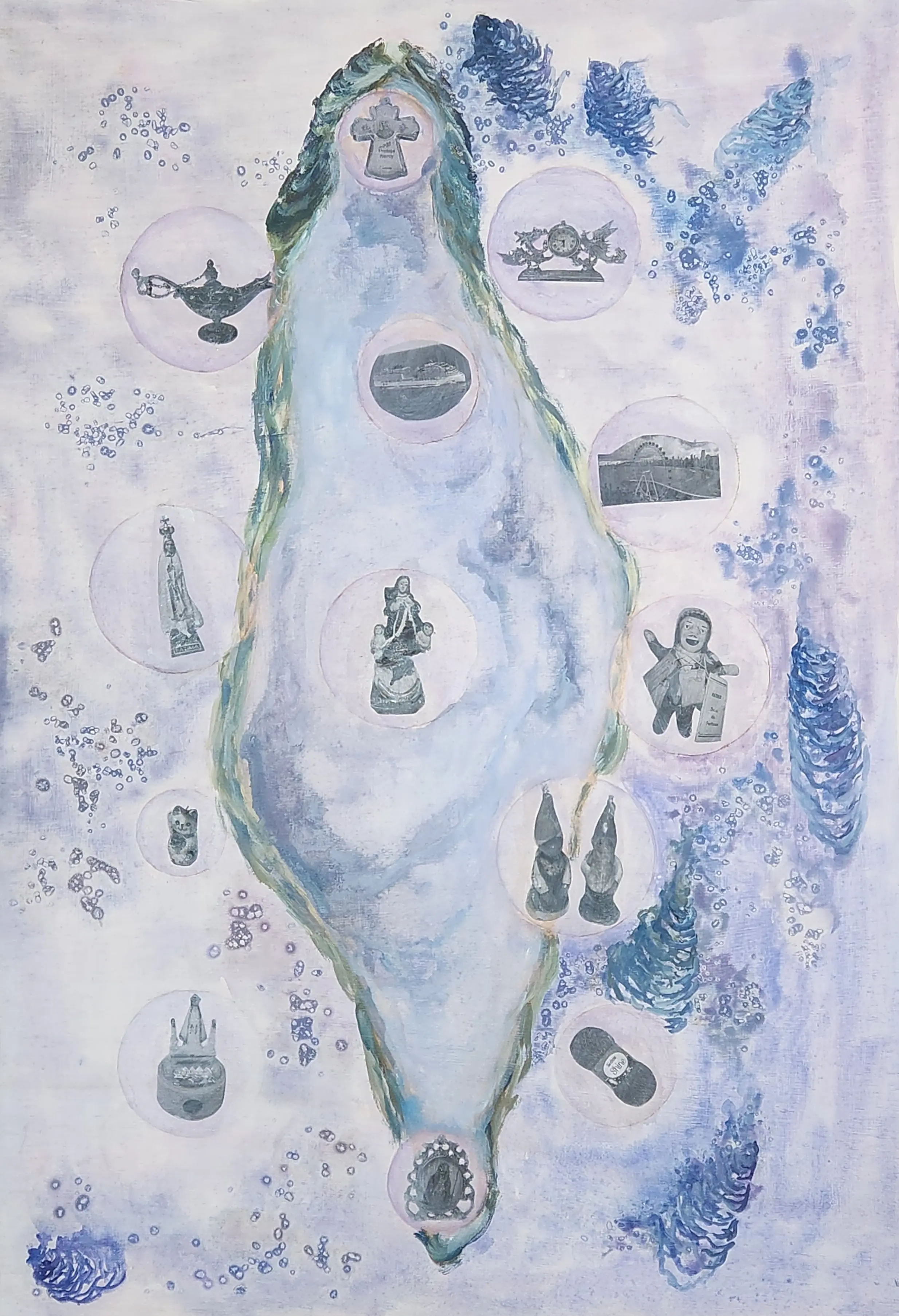Isolete Dozol criou a tela “Céu, Mar, Terra e Devaneios Civilizatórios” para entrar no mundo da Eli, onde, conclui, há que se manter um pé dentro, outro fora. “É muito fácil ser capturada pelos seus seres e criaturas imaginárias, porém poderosos, que nos espreitam de suas teias. Não atacam, mas ao menor descuido, seduzem”, observa.