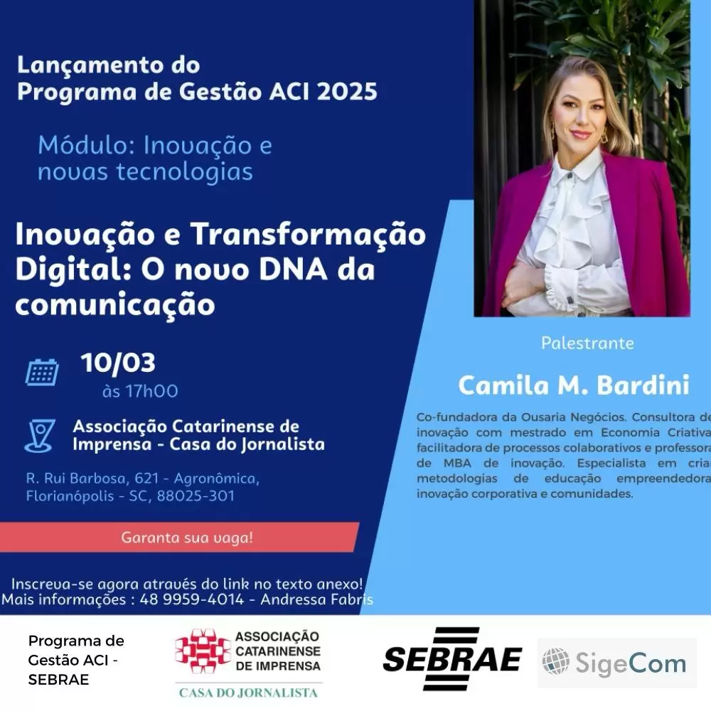 Durante o evento de abertura, a consultora de inovação Camila Bardini ministrará uma palestra sobre como a transformação digital impacta o ambiente comunicacional. Camila é especialista em inovação corporativa e atua na coordenação nacional de projetos do Polo Referência em Startups no Sebrae.