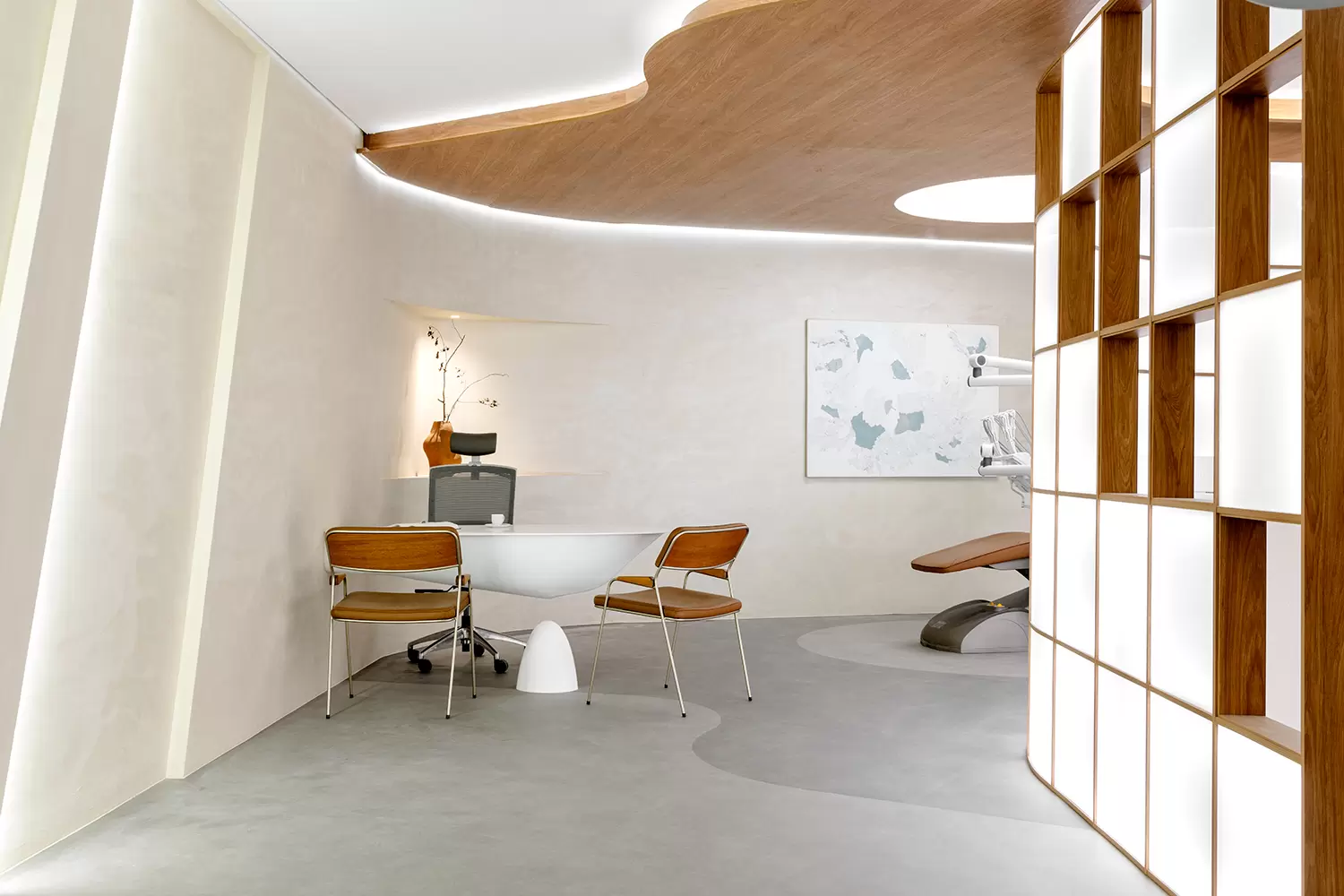 A escolha de materiais foi estratégica para unir estética e funcionalidade, como o couro ecológico das cadeiras e o uso da Superfície Sólida mineral da Durasein nas superfícies, garantindo durabilidade e fácil manutenção. No hall de entrada do ambiente, o balcão de atendimento abraça a recepcionista e faz divisão com a área de espera do paciente. A divisória em mdf acrílico leitoso, com iluminação no fundo contribui para a distribuição uniforme da iluminação. Os detalhes, como o forró desconectado do teto, feito com gesso acartonado e amadeirado, contribuem para a sensação de leveza.
