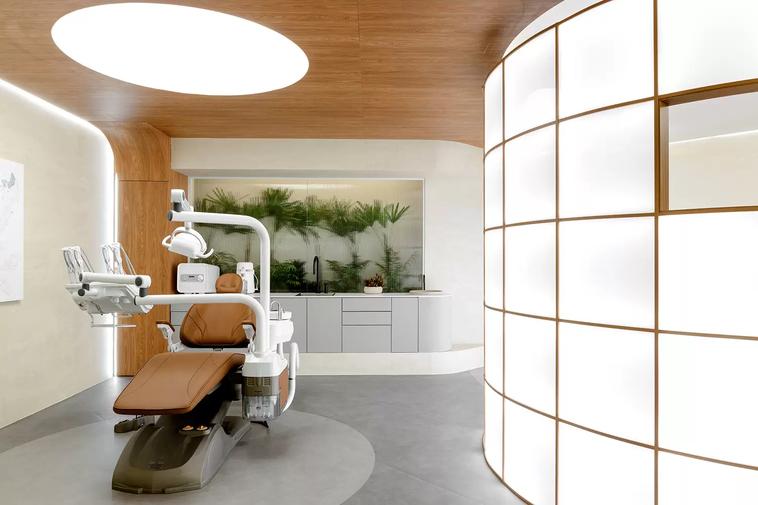 A concretização do projeto contou com o apoio de diversos parceiros. Entre os destaques estão a Durasein, fornecedora da superfície sólida mineral utilizada nas bancadas de atendimento, e a Capital Superfícies, responsável pelo processamento desse material. O mobiliário foi produzido pela Praia Comprida Móveis, com placas de MDF fornecidas pela Compensados Fernandes, que garantiram funcionalidade aliada ao design orgânico. A execução da obra foi realizada pela FZ Empreendimentos e pela NC3E Gerenciamento de Obras, enquanto as cadeiras odontológicas de edição limitada foram fornecidas pela OLSEN e os mobiliários soltos, pela MOAD. Todos os elementos se integram harmoniosamente para criar um ambiente sofisticado e acolhedor.