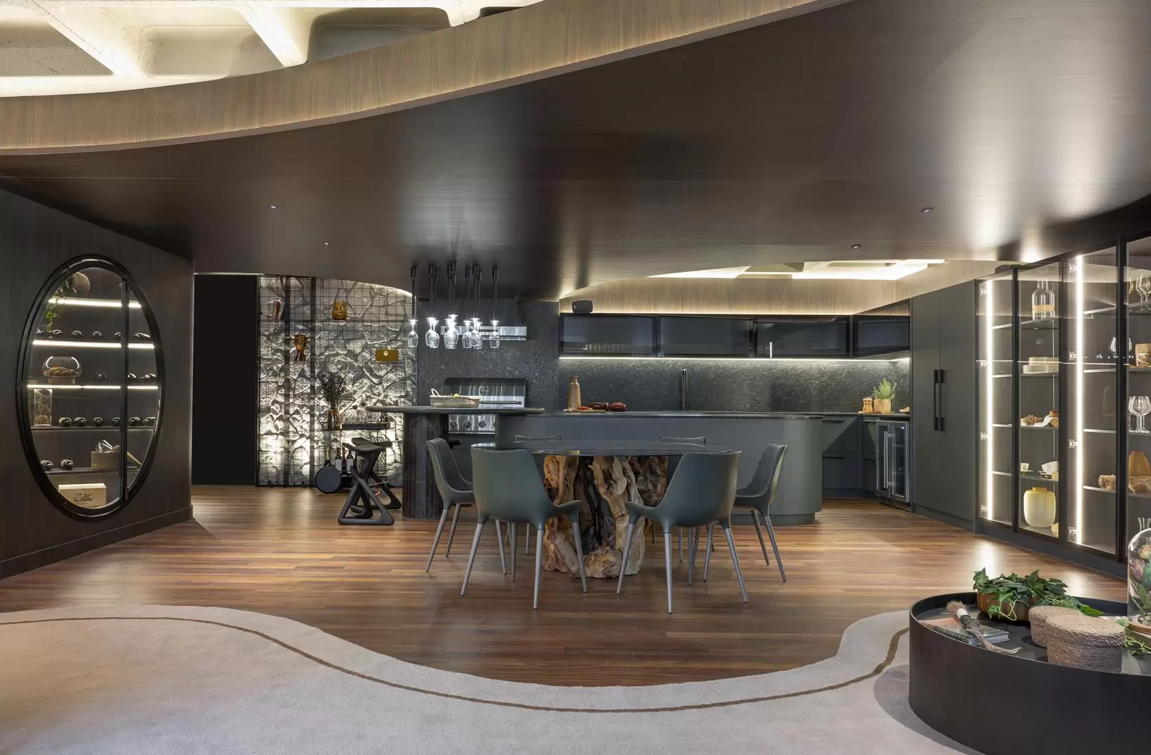 Agnes apostou em tons de madeira escura e no verde erva mate, aliando a simplicidade ao tema da mostra nesta edição, “De presente, o agora”. O conceito escolhido é uma resposta, e um convite a reconhecer que o mais alto luxo que podemos viver é no simples!