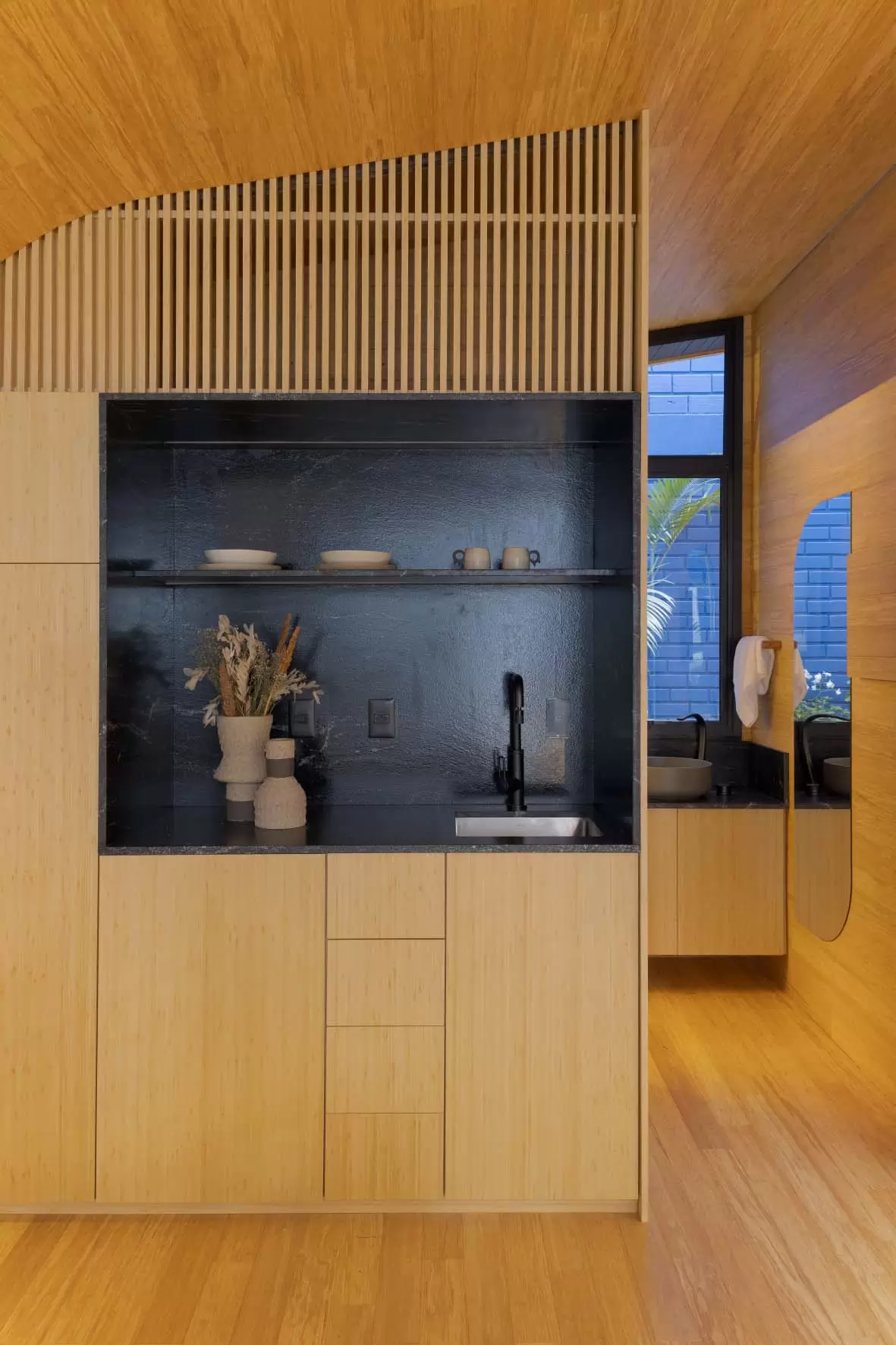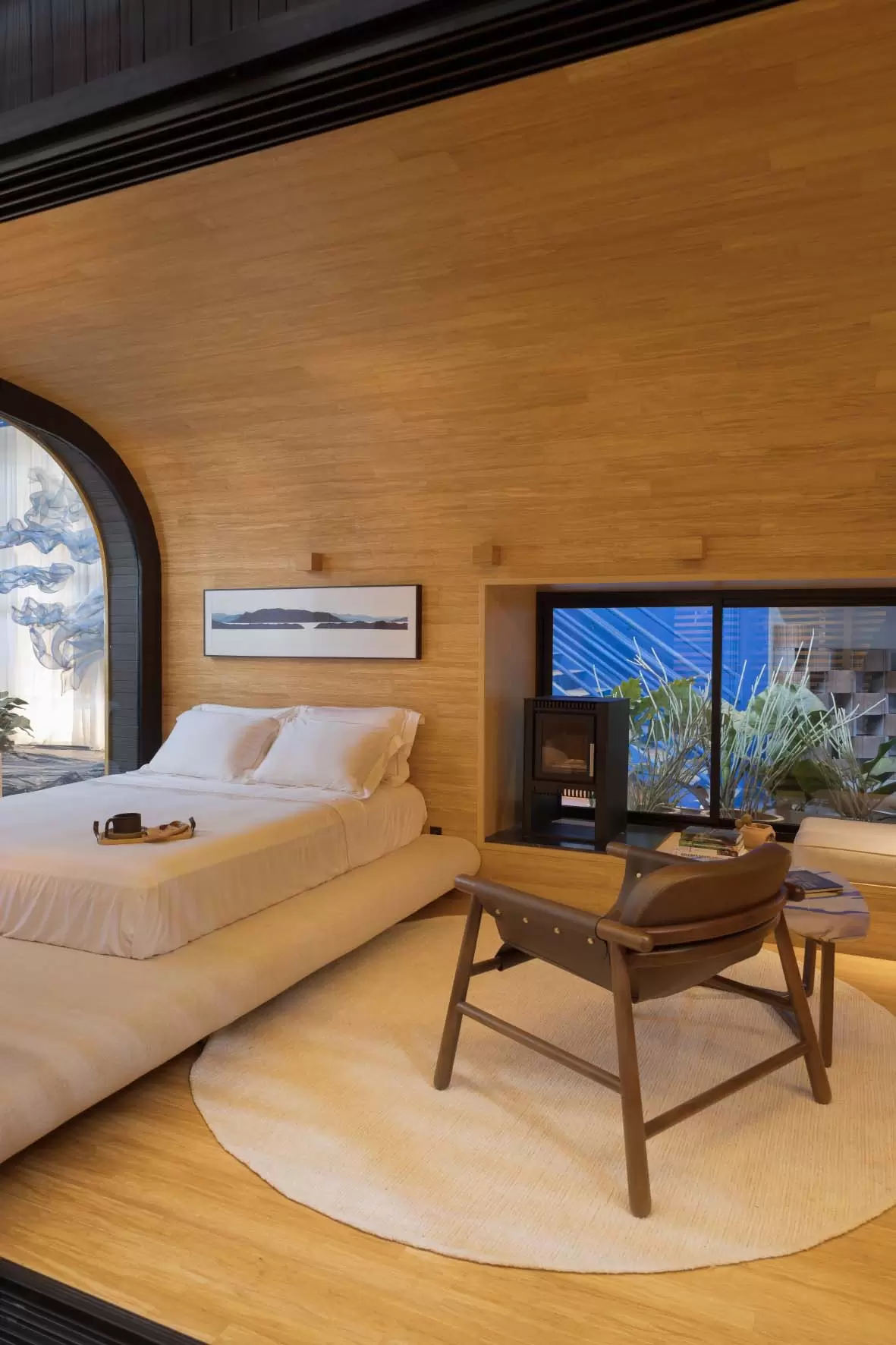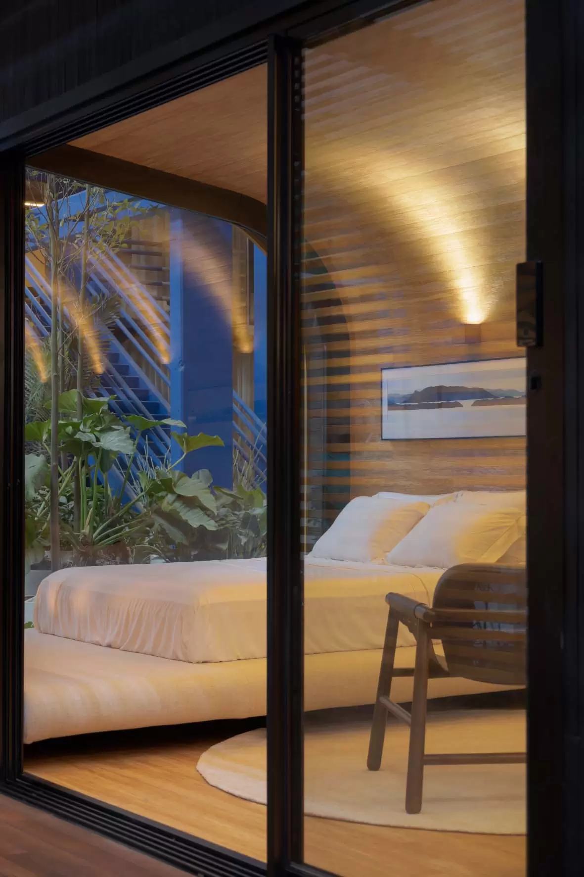 Fruto de uma pesquisa profunda em construção sustentável, a Nuoca representa uma síntese entre tecnologia e ancestralidade. Com 80% de sua composição feita em madeira e bambu – matéria-prima fornecida pela Morada Eco -, a casa é montada em estrutura modular off-site e conecta o morar contemporâneo à paisagem natural.