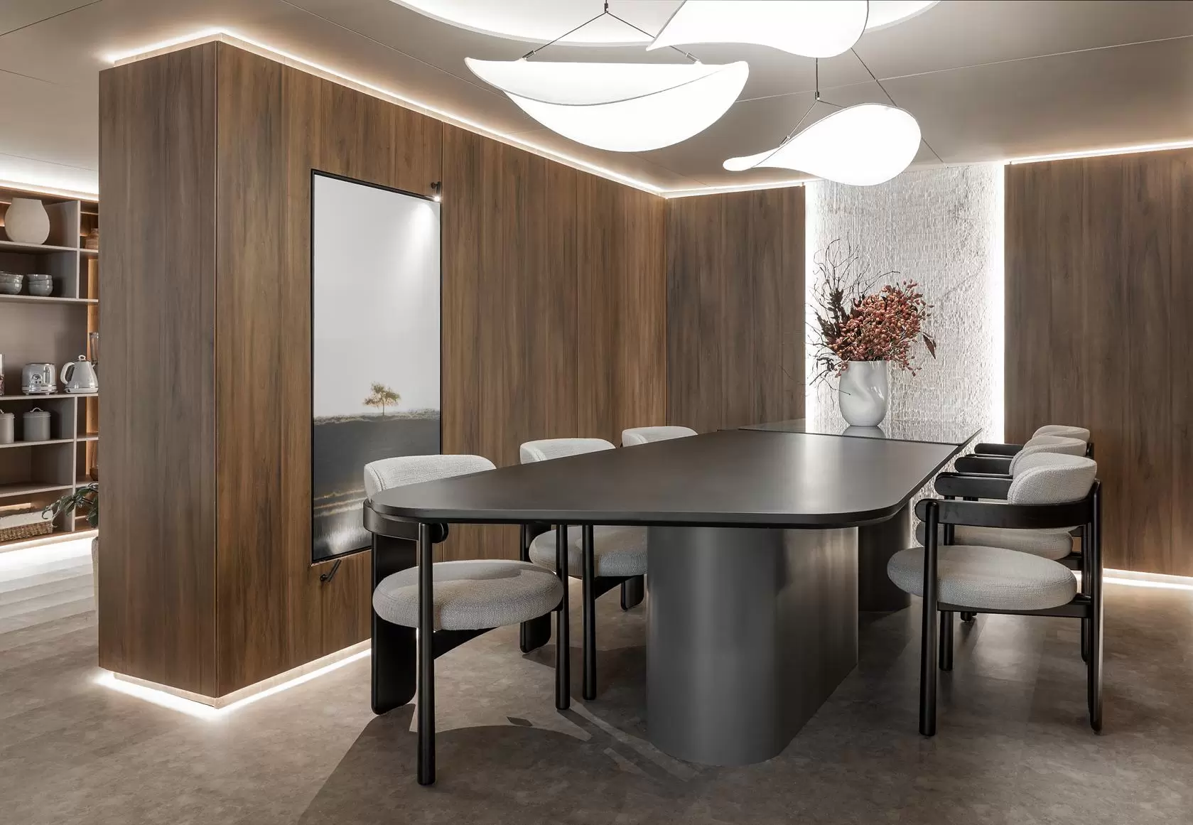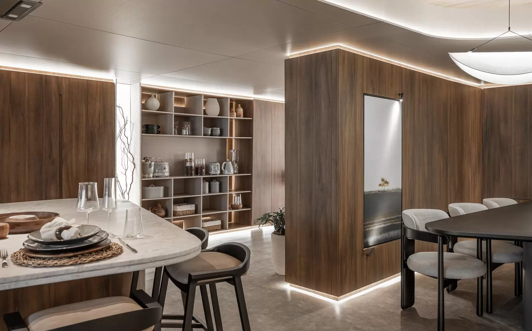Fitas de LED percorrem o rodapé e o topo dos painéis e mobiliários, criando a sensação de que tudo flutua — painéis, armários e teto parecem estar suspensos, ampliando a leveza e o refinamento do espaço.