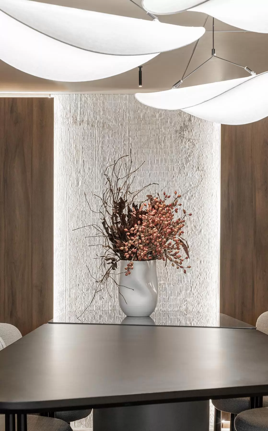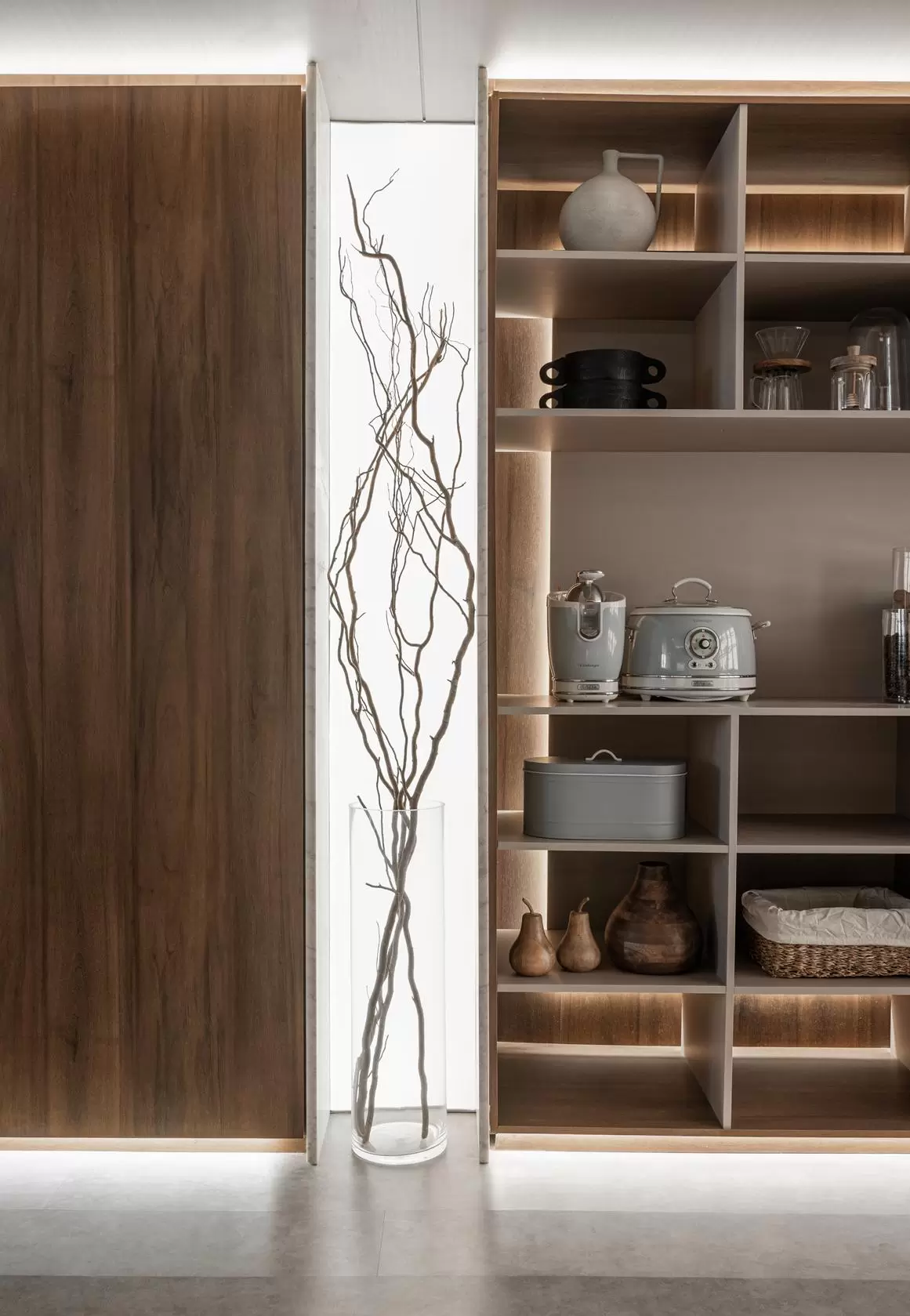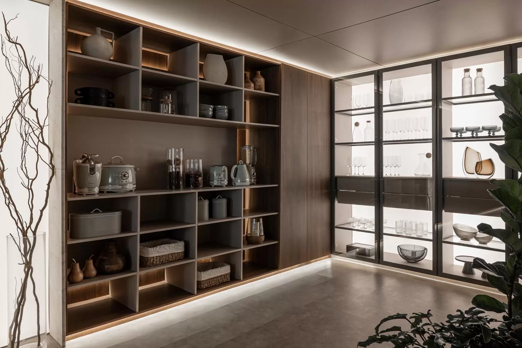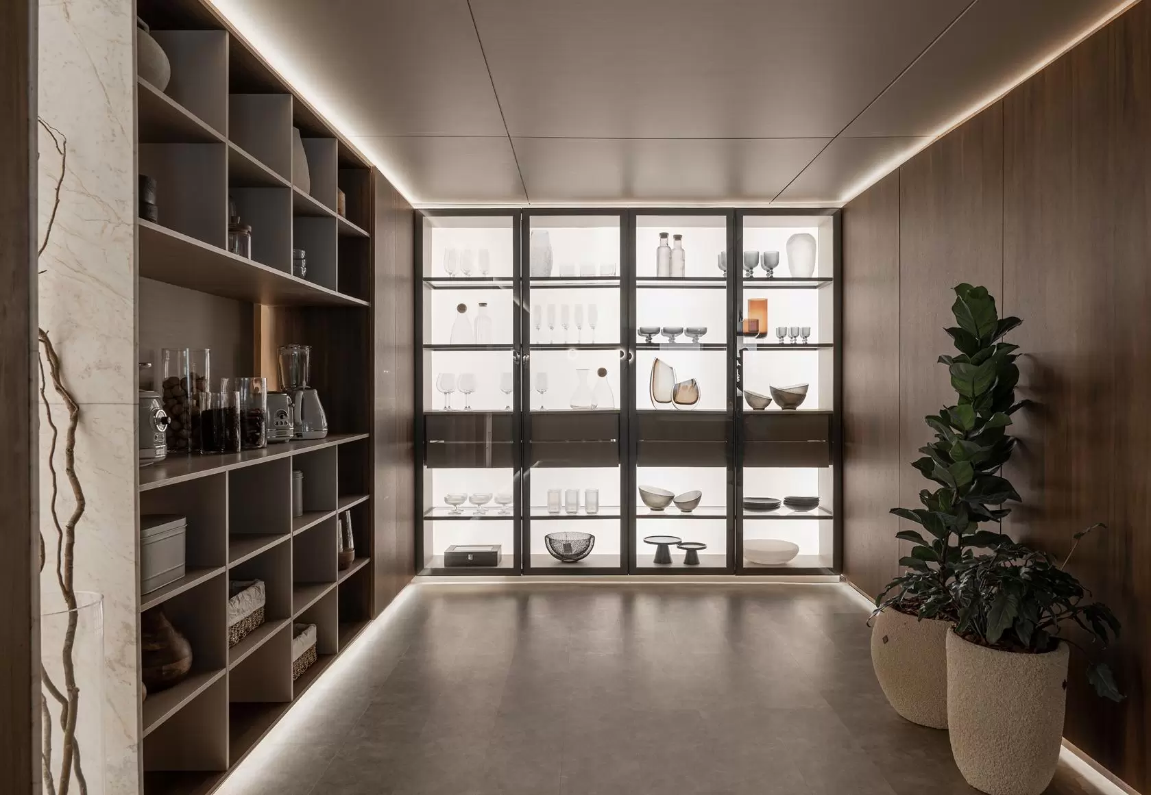 O projeto conta ainda com iluminação embutida em tela tensionada na cristaleira, proporcionando uma luz difusa de fundo. E, como destaque técnico e emocional, microspots direcionáveis iluminam pontualmente elementos como vasos, banquetas e objetos afetivos, criando focos de atenção e narrativa visual.