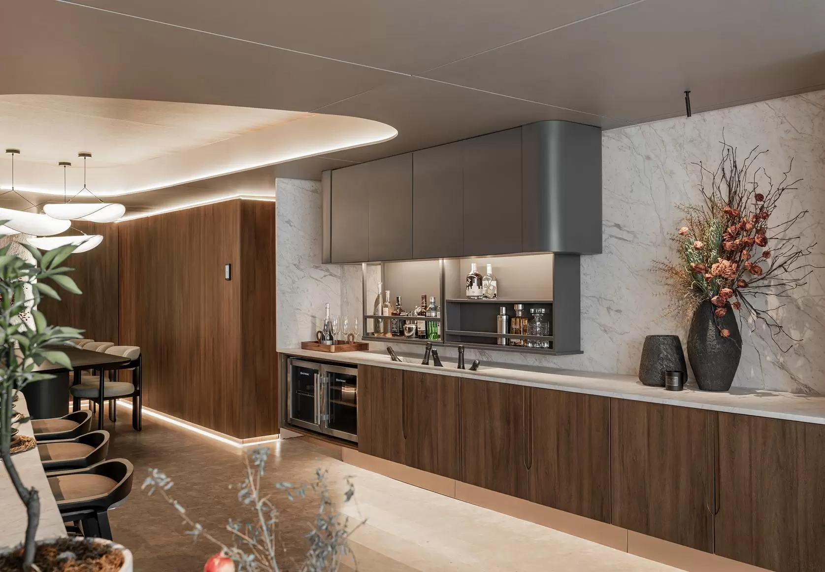 Nelson destaca o uso de MDF amadeirado na tonalidade cacau e MDF Lumi Dust no teto, ambos lançamentos da Berneck; Mármore Calacatta Lotus, com veios rosados e acinzentados, presente em bancada, nichos e painéis, além da Laca grafite e elementos metalizados, que complementam a paleta com sofisticação e contraste.