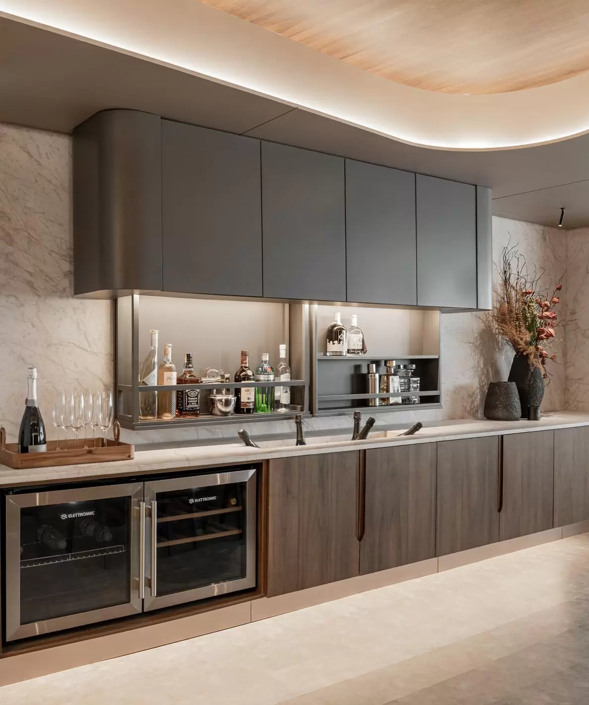 O ambiente é marcado por materiais que refletem as principais tendências da última Feira de Milão, destacando principalmente a presença da marcenaria e da marmoraria como protagonistas do ambiente.