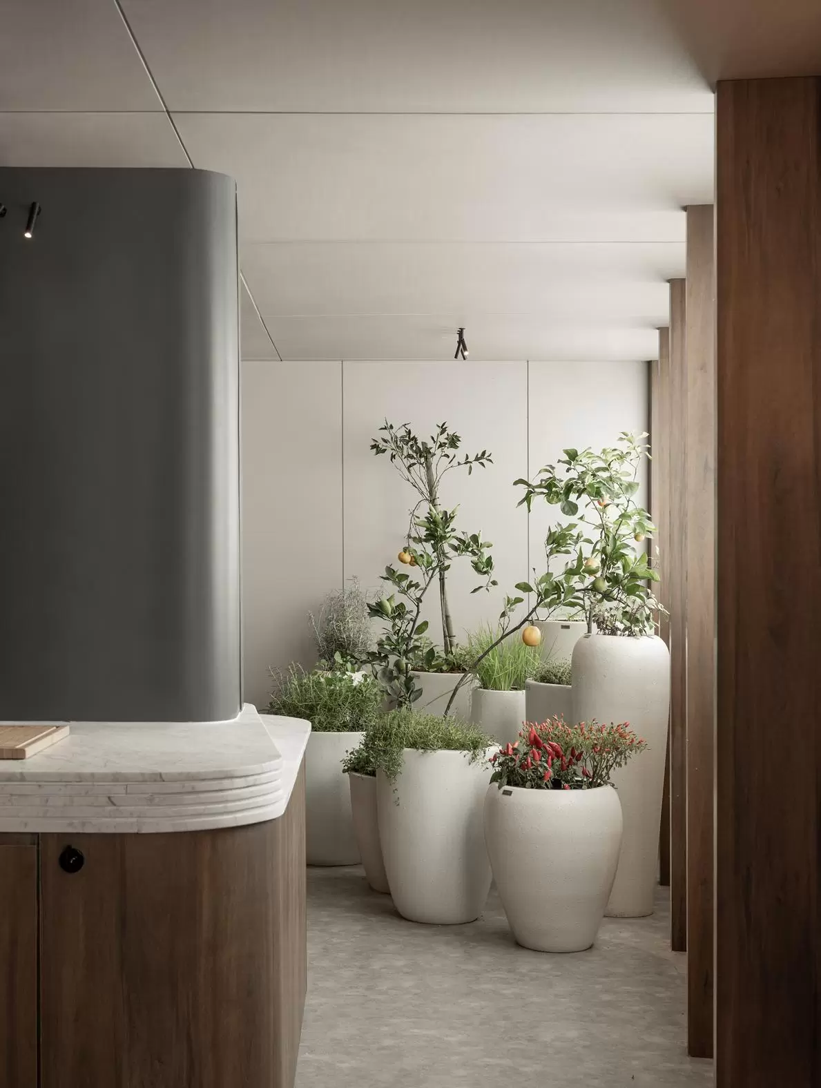 Dentro da Cozinha Semente, vasos decorativos integrados ao ambiente compõem uma mistura sensorial de pomar frutífero e horta de temperos e chás. Uma forma de trazer a natureza de forma viva e funcional para dentro do espaço, evocando memórias, aromas e sabores — e reforçando a essência de uma cozinha com alma, afeto e presença.