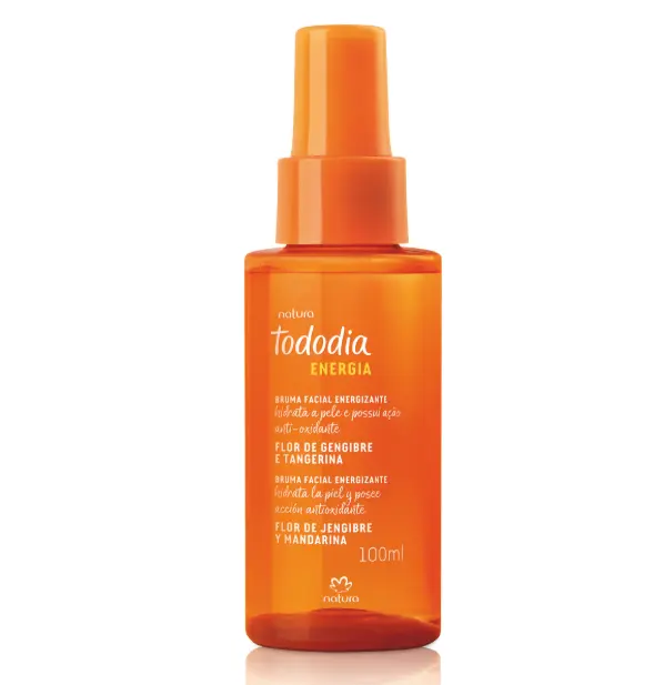 Bruma facial Natura Tododia Energia - R$52,90Com embalagem prática, que cabe na bolsa, a Bruma Facial Natura Tododia Energia foi pensada para acompanhar a rotina ao longo do dia. Sua fórmula com nutrição prebiótica e vitamina E oferece ação antioxidante, ajudando a manter a pele hidratada e confortável. A fragrância energizante de flor de gengibre e tangerina traz sensação imediata de frescor e revitalização. Ideal para usar antes, durante ou depois da maquiagem.