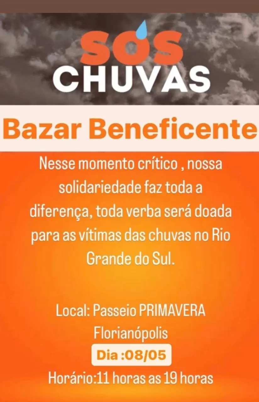 Teremos bazar beneficente onde 100% do que for arrecadado será revertido às vítimas das enchentes no Rio Grande do Sul.