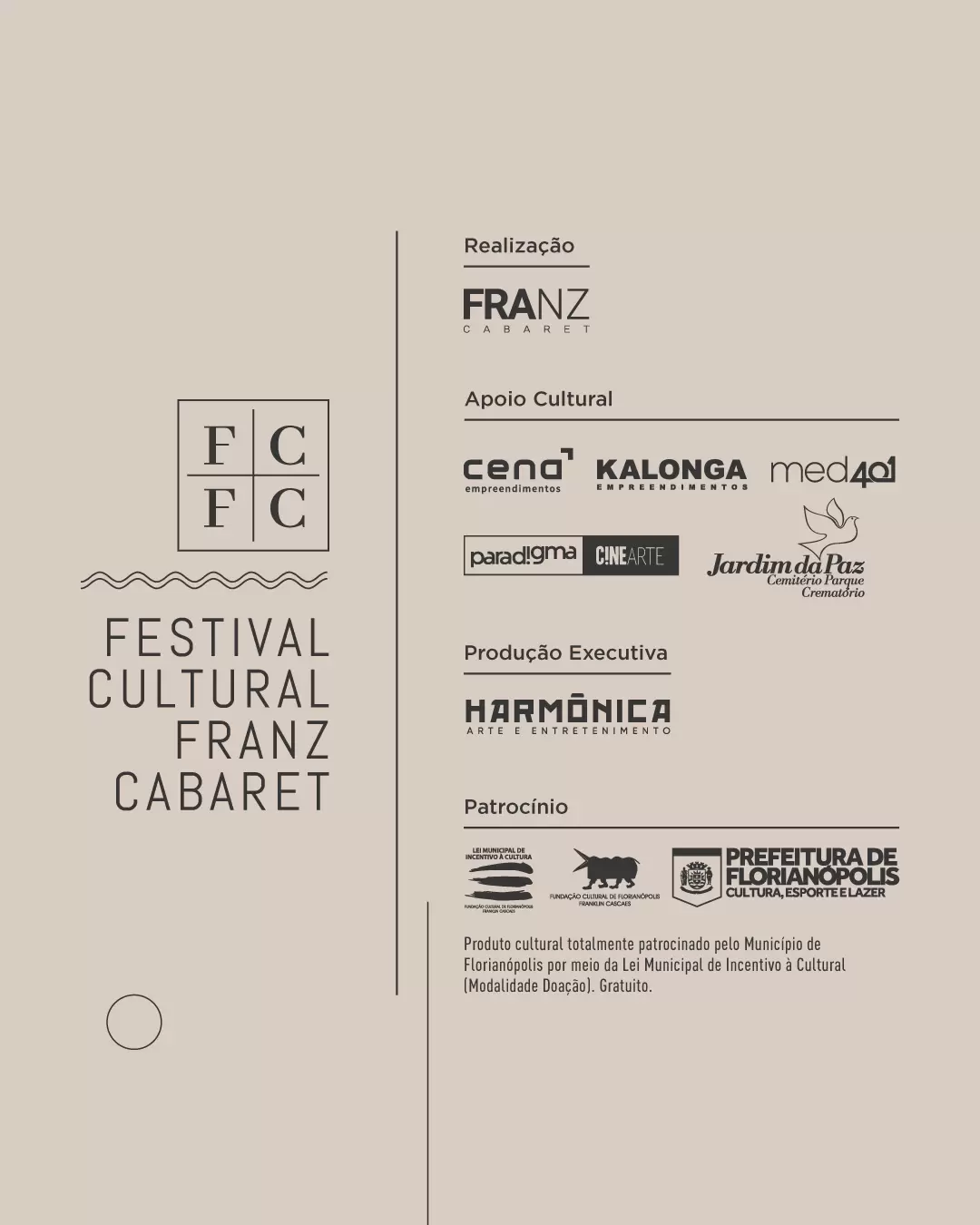 O Festival Franz Cabaret é uma realização do Franz Cabaret, com produção executiva da Harmônica Arte e Entretenimento. Conta com o apoio cultural das empresas Kalonga Empreendimentos, Cena Empreendimentos, Jardim da Paz, Paradigma Cine Arte e MED401. O evento é viabilizado também por meio de um amplo movimento de moradores de Florianópolis que destinaram uma porcentagem de seu IPTU ao projeto. São eles: Matheus Accioly Kwiatkowski, Willian Anderson Martins da Silva, Maria Carolina de Miranda Grieco, Rodrigo Seara Cassol, Luciane Fialho Daux, Luiza Dal Asta, Felipe Didone, Clica Voigt, Si Voigt, Voigt Administração, Luciano Nascimento Saporiti, Centro Médico Ilha e Edith Gondin.