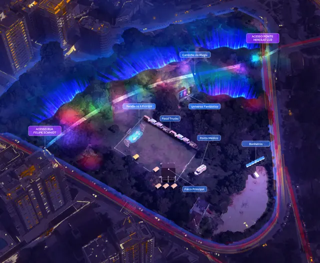 Caminho da Magia – percurso sensorial que liga a Rua Felipe Schmidt às ativações e à Ponte Hercílio Luz. Sensores de presença ativam luz e som nas árvores à passagem do público.