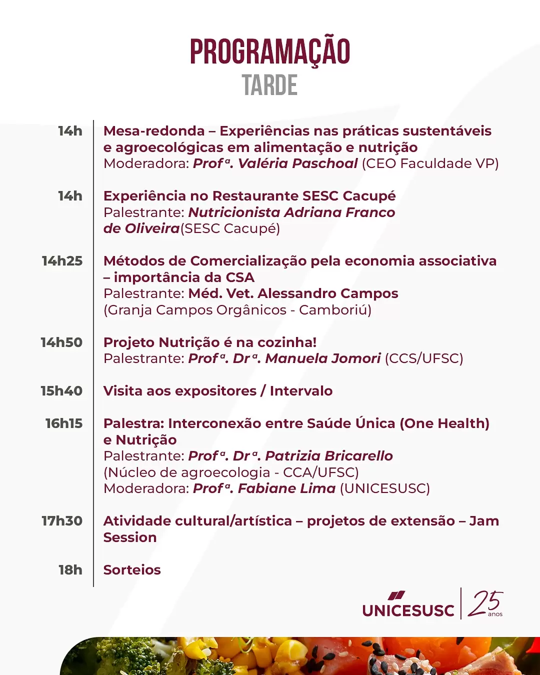 O evento oferece ainda palestra sobre a visão integrada entre saúde humana, animal e ambiental que será proferida pela Prof. Dra Patrizia Bricarello do Núcleo de Agroecologia da UFSC, bem como visita a expositores, atividade cultural com o Projeto de Extensão Jam Session, sorteio de brindes para participantes presenciais e estacionamento gratuito. Para conferir a programação completa, acesse o link: https://www.sympla.com.br/evento/ii-encontro-do-curso-de-nutricao-do-unicesusc-nutricao-saude-e-sustentabilidade-planetaria/3137692.