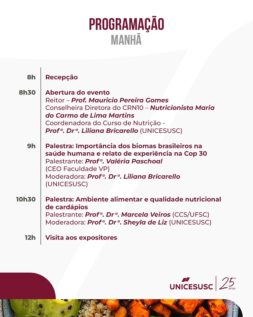 Florianópolis recebe no dia 29 de novembro especialistas em temas que debatem a nutrição, a sustentabilidade, meio ambiente e saúde no II Encontro do Curso de Nutrição do Unicesusc. A programação será das 8h às 18h, no auditório da instituição, na SC-401, com participação presencial e on-line.