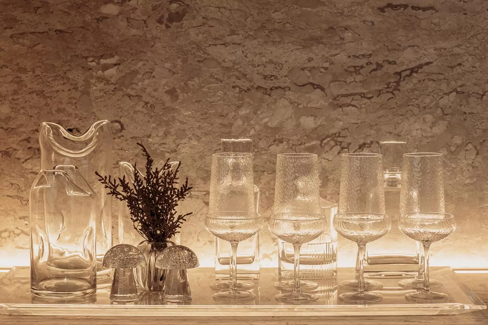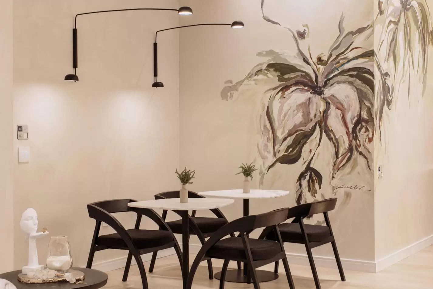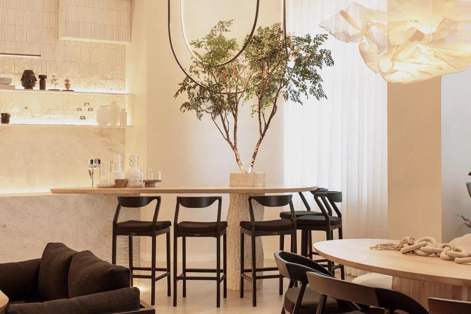 No espaço o layout flui naturalmente, com formas orgânicas e circulações amplas. O balcão fechado dá lugar a uma atmosfera de espaço gourmet residencial, onde você se sente recebido como em casa. De um lado, o café, ponto de partida das boas conversas; do outro, os vinhos, acompanhados por um lounge aconchegante e banquetas altas, que convidam a desfrutar o momento. Para a área de mesas, ela apostou num mobiliário confortável, sofás e diferentes formatos que quebram a formalidade e criam um ambiente dinâmico, autêntico.