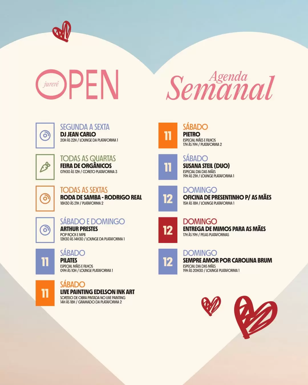 Neste final de semana (11 e 12 de maio), o Jurerê OPEN, em Jurerê in_,apresenta uma programação especial dedicada às mães. As atividades para toda a família acontecem ao ar livre, são gratuitas e incluem exposição de obras de arte, shows musicais, distribuição de mimos, atividades físicas e recreação para as crianças - tudo preparado com muito carinho em homenagem a elas.