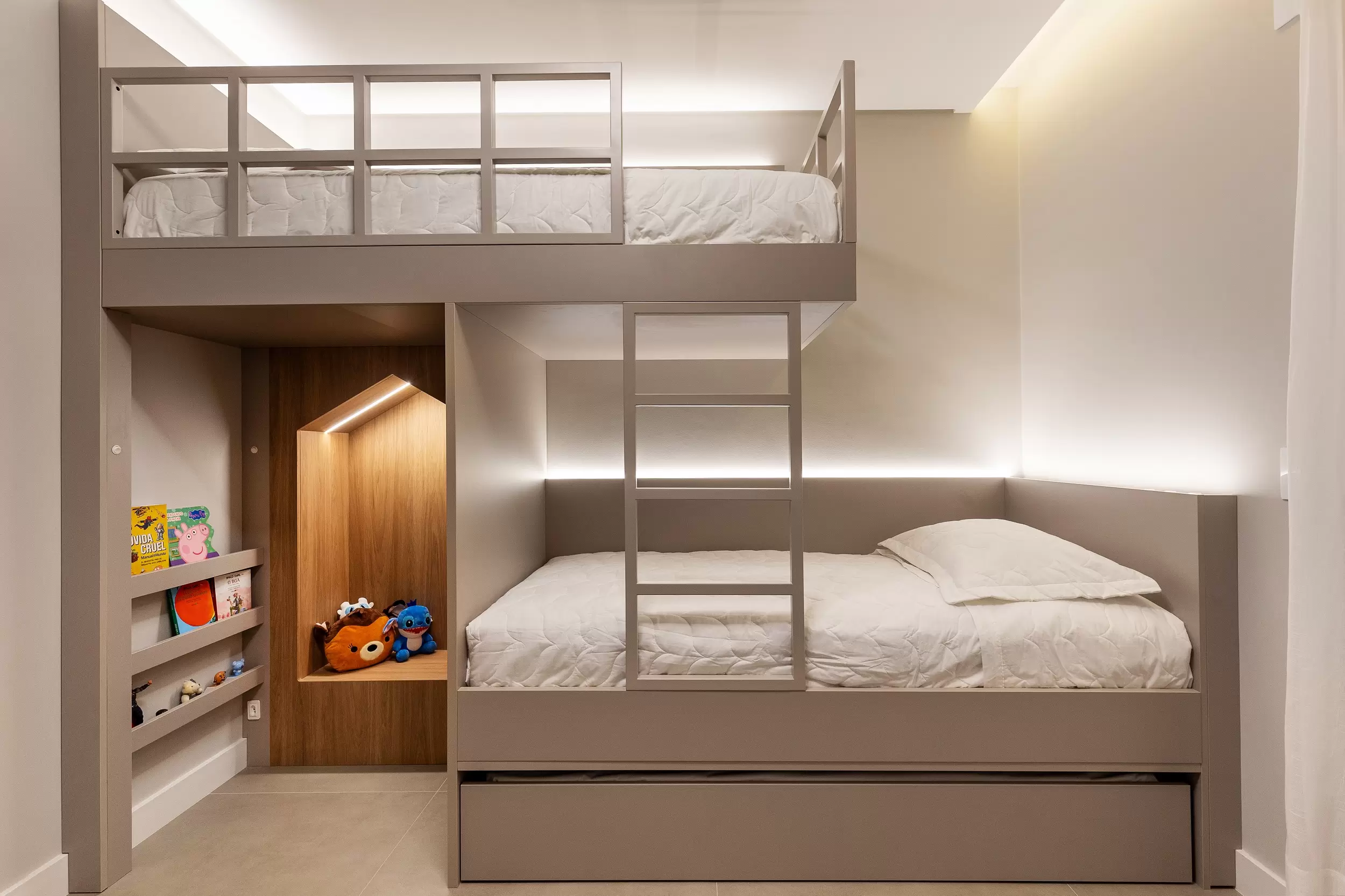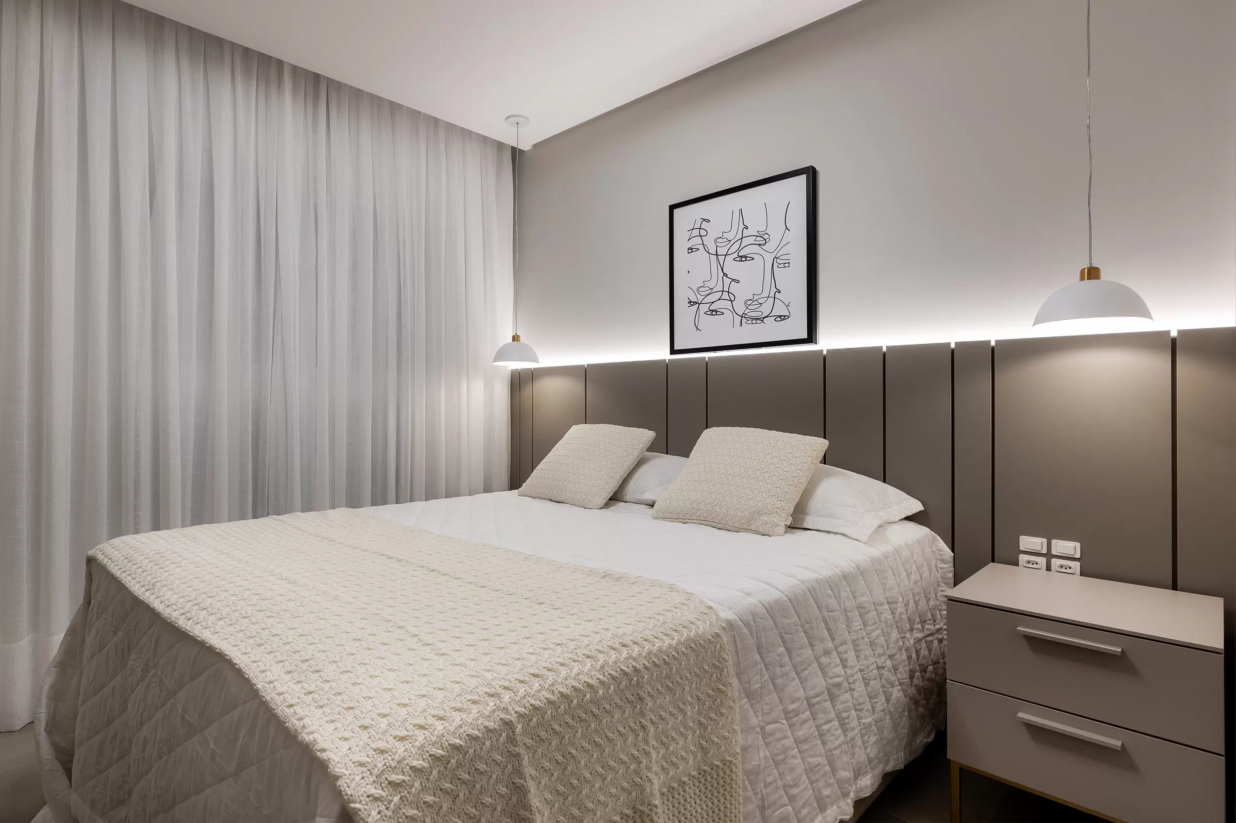 Elementos sutis ajudam a definir os espaços sem quebrar a integração. Um exemplo é a ilha na cozinha, onde está localizado o fogão, e detalhes em gesso que separam visualmente os ambientes sem comprometer a fluidez. Para reforçar o estilo minimalista, os móveis foram escolhidos com linhas orgânicas e acabamentos neutros, enquanto o projeto luminotécnico personaliza a iluminação para diferentes momentos do dia. Suítes: Conforto e Elegância Todos os quartos do apartamento são suítes, projetadas para oferecer conforto e sofisticação. Embora sigam a mesma linguagem visual do restante do apartamento, com paletas claras e materiais neutros, cada suíte apresenta variações sutis nos acabamentos para trazer personalidade sem fugir do conceito principal.