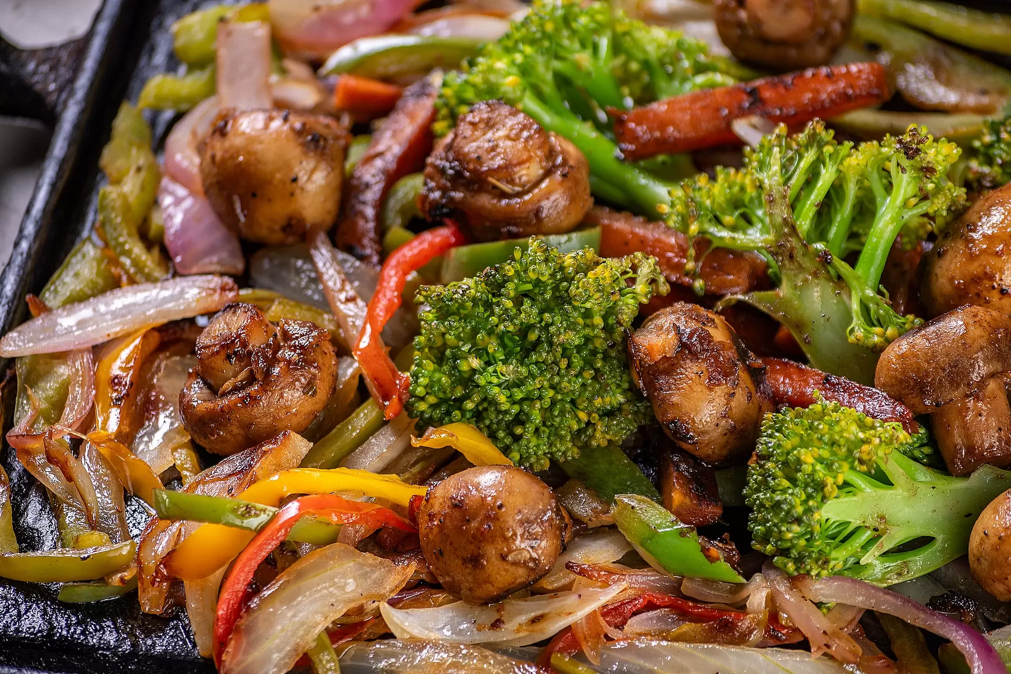 Cogumelo mex, cenoura defumada e brócolis sobre cama de mix de cebola e pimentões. Acompanha tortilla de trigo, frijole, arroz mexicano, guacamole, creme de milho e pico de gallo.