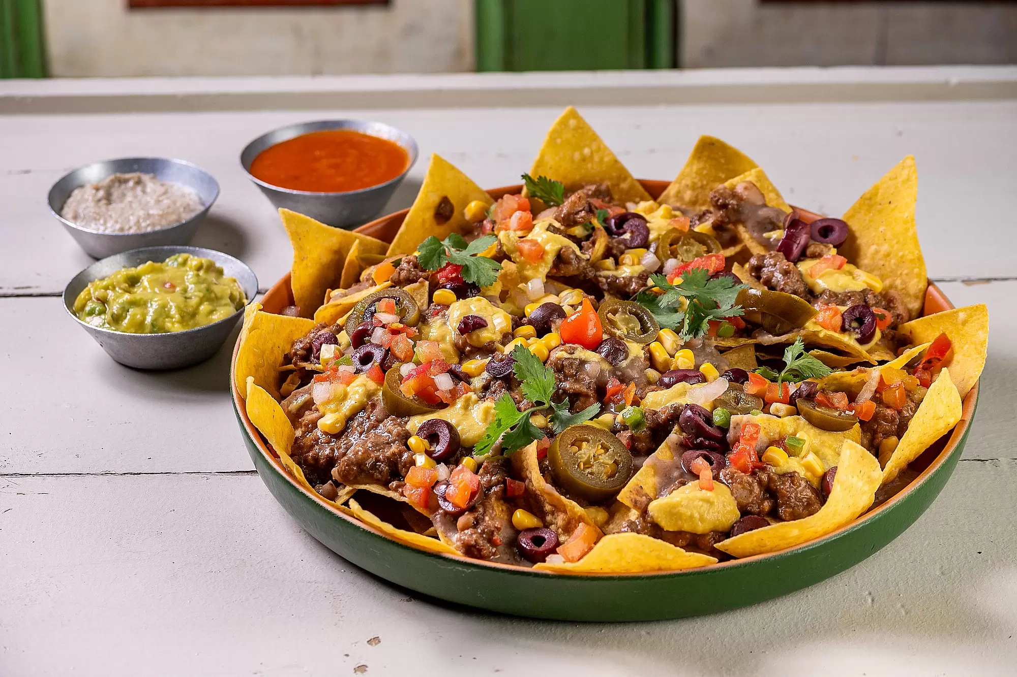 Tortilla chips da casa coberta com frijole, chili vegano, creme de milho, azeitona preta, milho verde, pimenta jalapeño, pimenta biquinho e coentro para decorar. Acompanha creme de queijo a base de sementes de girassol, pico de gallo e guacamole.