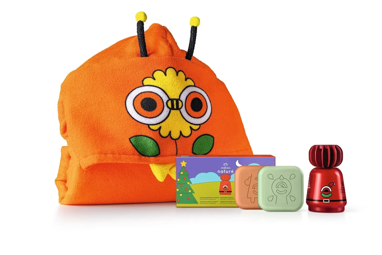 Um presente cheio de aventuras e sustentabilidade. A edição especial de Natura Naturé traz, na temática natalina, a água de colônia Corre Corre, sabonetes e um poncho atoalhado infantil feito de PET reciclado. Macio, leve e divertido, o acessório vem com capuz e aplique do personagem Naturé — ideal para o banho, a praia ou a piscina.