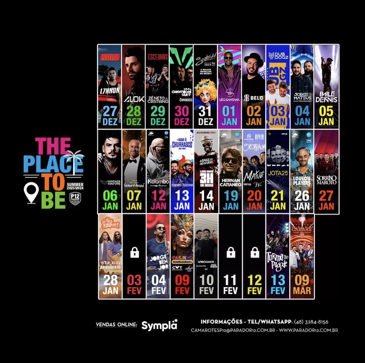 O parador de praia mais famoso do Brasil anuncia a maior sequência de shows do país com mais de 70 atrações nacionais e internacionais, de 27 de dezembro a 9 de março. Entre os nomes confirmados estão Alok, Vintage Culture, Jorge & Matheus, Léo Santana, Thiaguinho, Jorge Ben Jor, Dubdogz, Zé Neto & Cristiano, Jota Quest, Cabaré com Leonardo e Bruno e Marrone, Alexandre Pires, Dennis e muito mais.