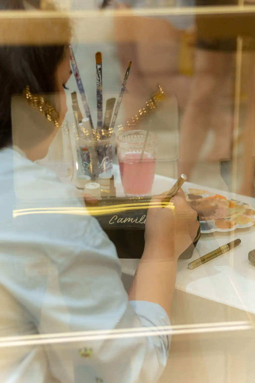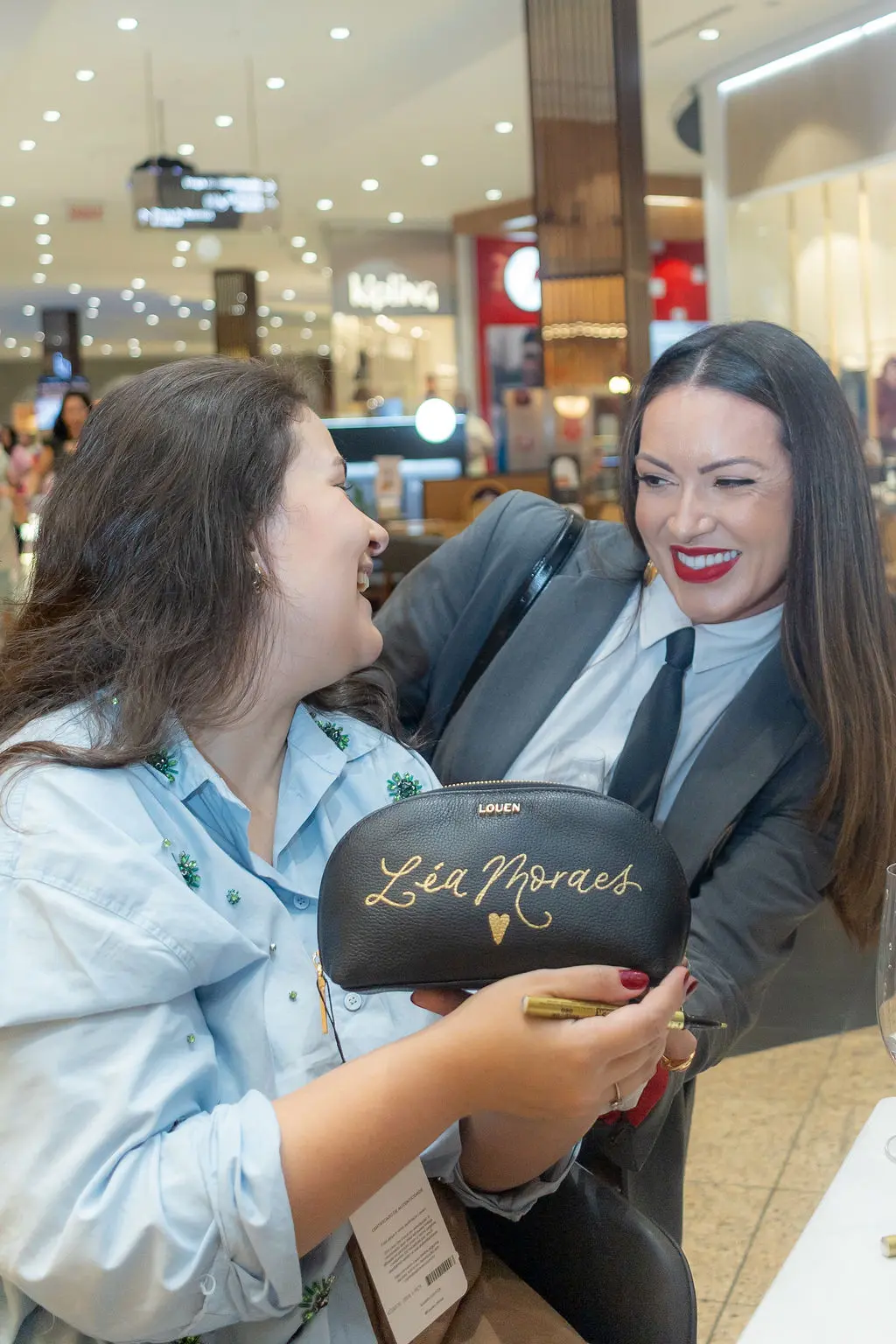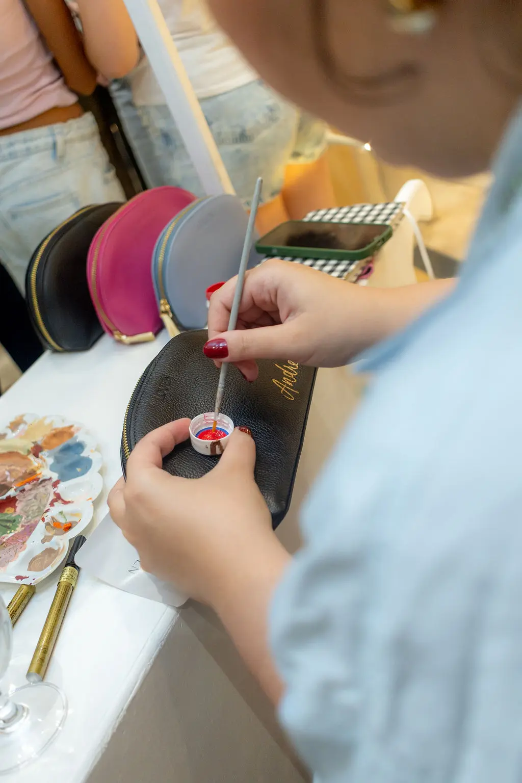 Quem passou pelo evento ganhou um acessório da marca, que foi customizado manualmente com as iniciais, ou nome das convidadas, pela profissional de lettering Gabriela Regis.