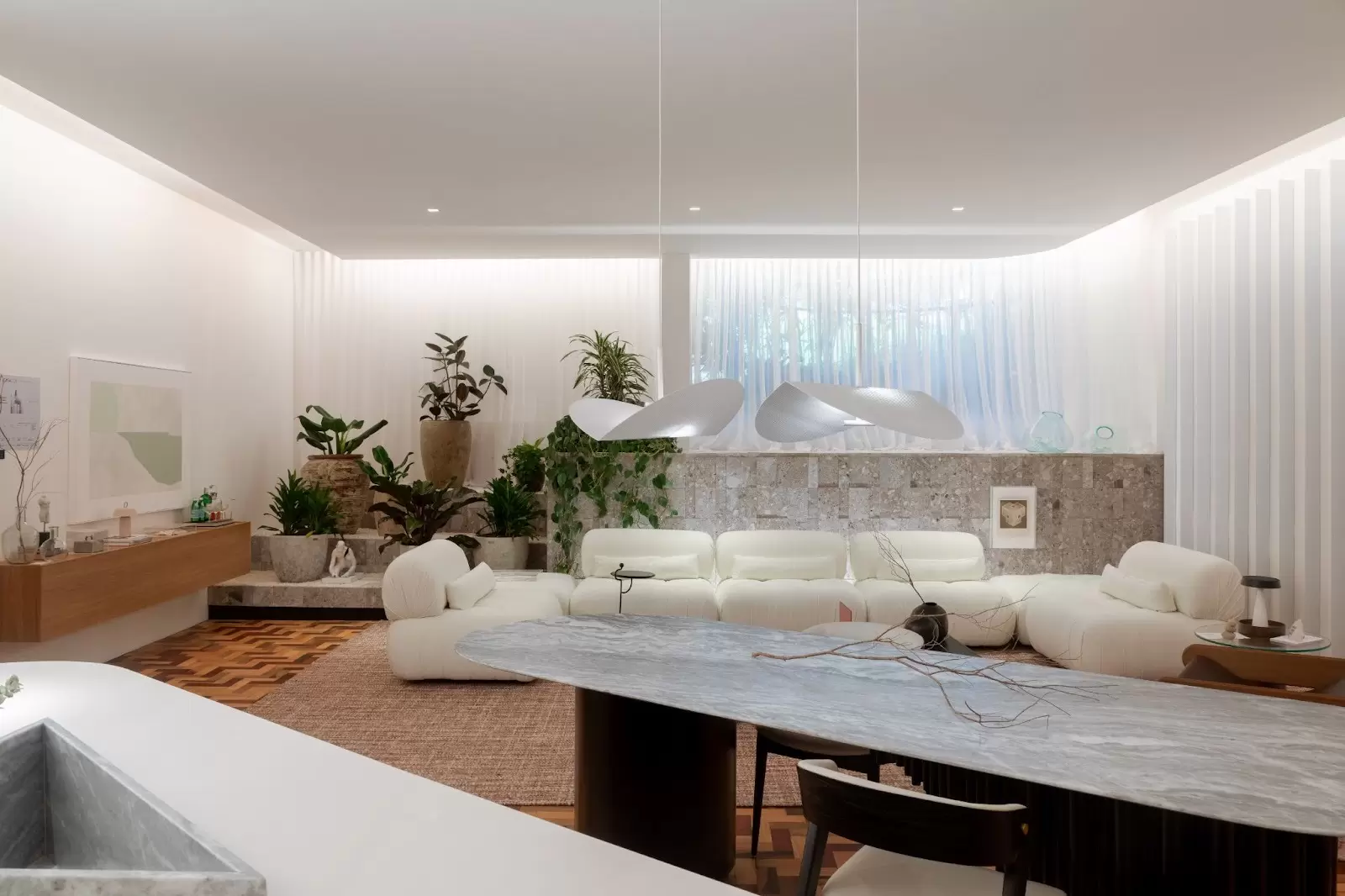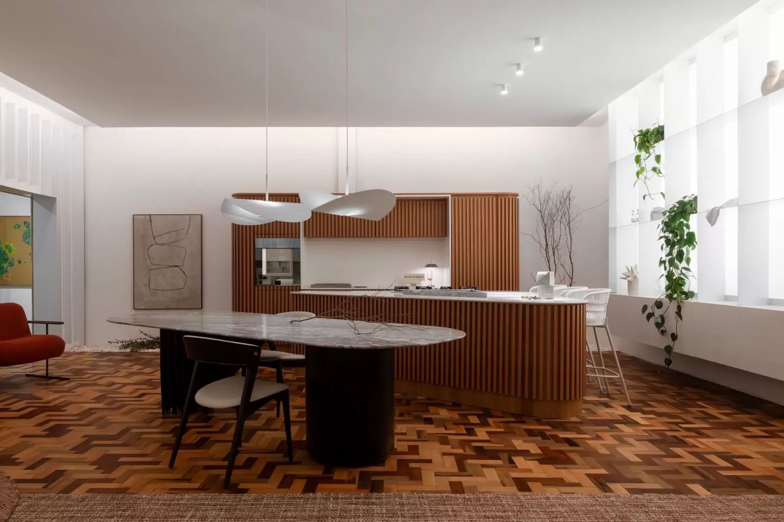 Ao redor, ripas de chapas metálicas pintadas em branco garantem movimento e suavidade. Mais à frente, na cozinha, painéis de MDF ripado são a companhia perfeita para os tampos feitos em Dekton Aura, da Cosentino (mesa, ilha e bancada da cozinha).