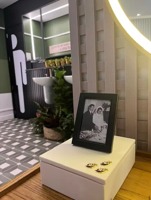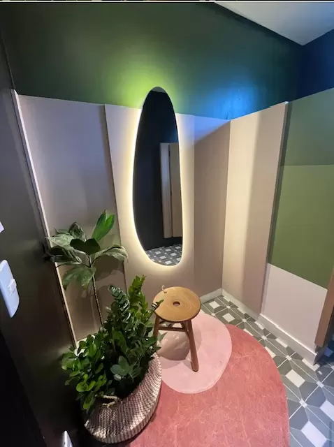 No quarto ambiente estão as áreas dos banheiros masculino e feminino com sanitários, também com paredes pintadas na simplicidade do degradê do verde ao branco. Numa parede preta uma uma caixa de acrílico na parede com fundo branco com branco guarda relíquias da bisavó da artista Bela, paninhos de crochê bordados a mão. Esta é outra referência às habilidades manuais da vó Manuela. Espelho orgânico desenhado por Geovanna e mais plantas dão acabamento aos ambientes.