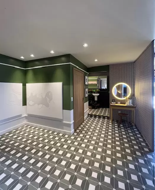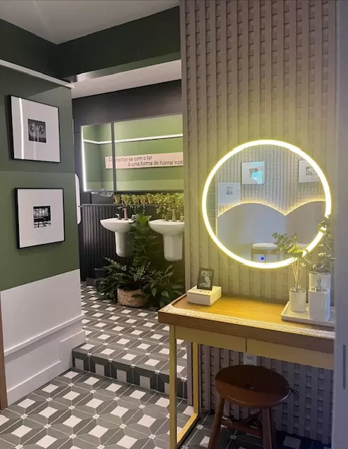 No terceiro ambiente, pintado no degradê de verde até o branco, estão as cubas no estilo Belle Époque da DECA com torneiras cromadas Duna, também da Deca, unindo o passado e o presente da marca, e remetendo a um banheiro do tempo da sua avó com ares contemporâneos. Ao fundo das cubas, está um painel ripado preto e mais plantas, claro. Nesta área mais fotos em preto e branco do hotel Maria do Mar dividem espaço com a frase de Giovanna:” Conectar-se com o lar é uma forma de honrar nossas raízes” escrita de trás pra frente na parede de forma que possa ser lida corretamente pelo espelho enquanto lava-se as mãos.