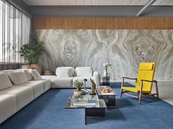 A arquiteta ressalta os principais materiais que compõem o ambiente, como as pedras naturais,