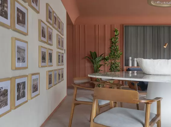 Totalmente em sintonia com as principais tendências do mercado, o projeto contempla linhas curvas (orgânicas), tanto nos móveis soltos como nas paredes e objetos de design assinado. A cor terracota, remetendo aos tijolos desses 41 anos da RDO e as escolhas dos objetos de estima deixam o ambiente comercial com a atmosfera acolhedora de uma residência. O tampo da mesa, com design orgânico em pedra natural é outro destaque. Um pendente cravejado de cristais conversa com um objeto decorativo à mesa, com a mesma pedra.