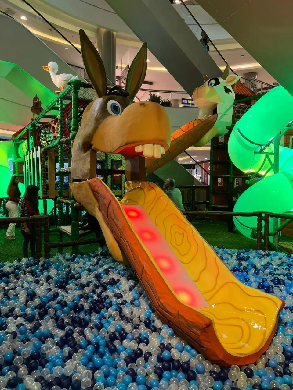 A fazendinha conta ainda com torre elástica, passarelas, escorregadores e piscina de bolinhas.