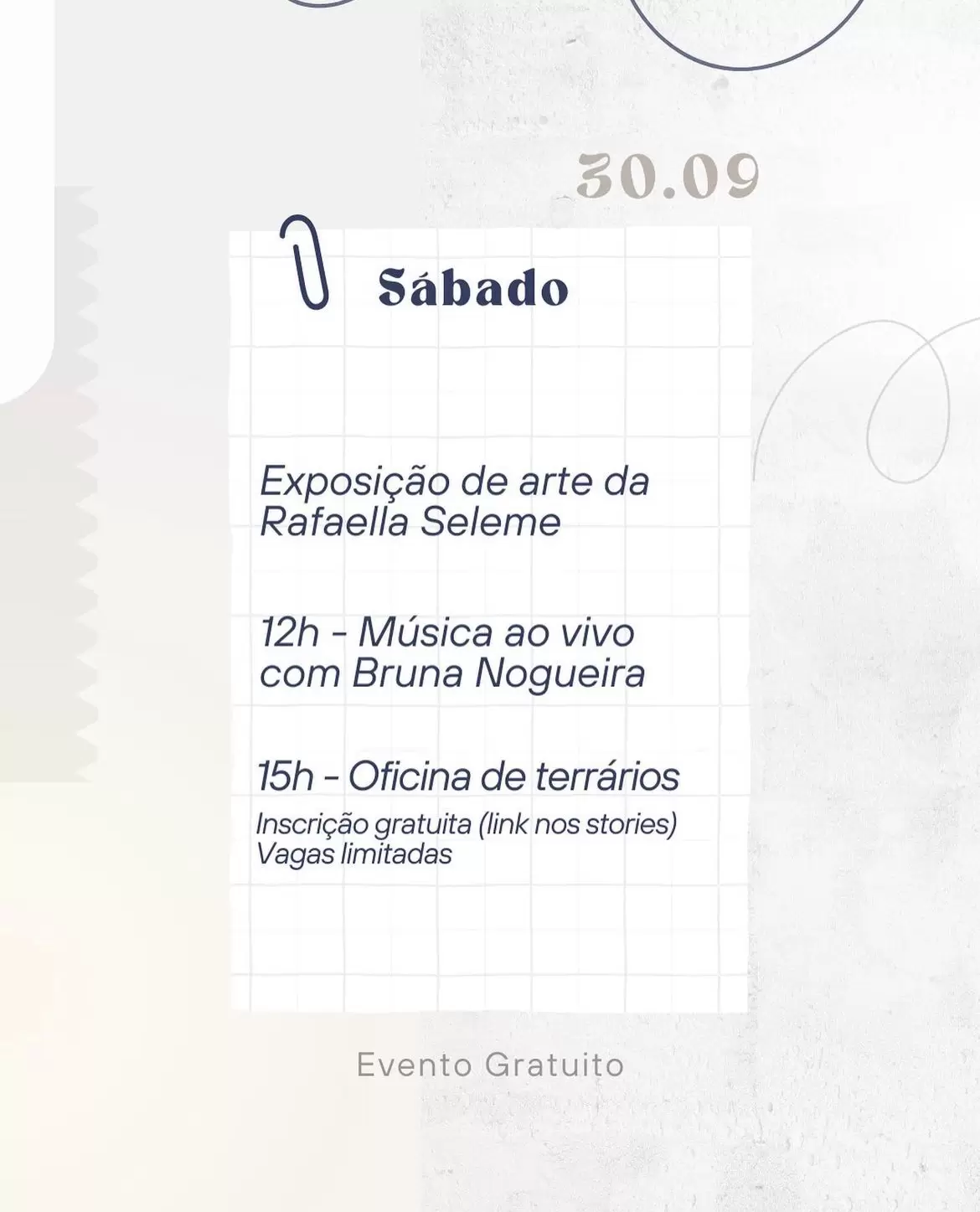 A grande novidade fica por conta da Oficina de Terrários, que acontece no sábado, às 15h, e será gratuita. Mas fique atento pois as vagas são limitadas. “Será possível entender de forma prática sobre o equilíbrio botânico,além de aprender sobre o tipo de vidro, a espécie de planta e a criar paisagens inspiradas na natureza”, explica Natália Rodrigues, professora da Oficina.