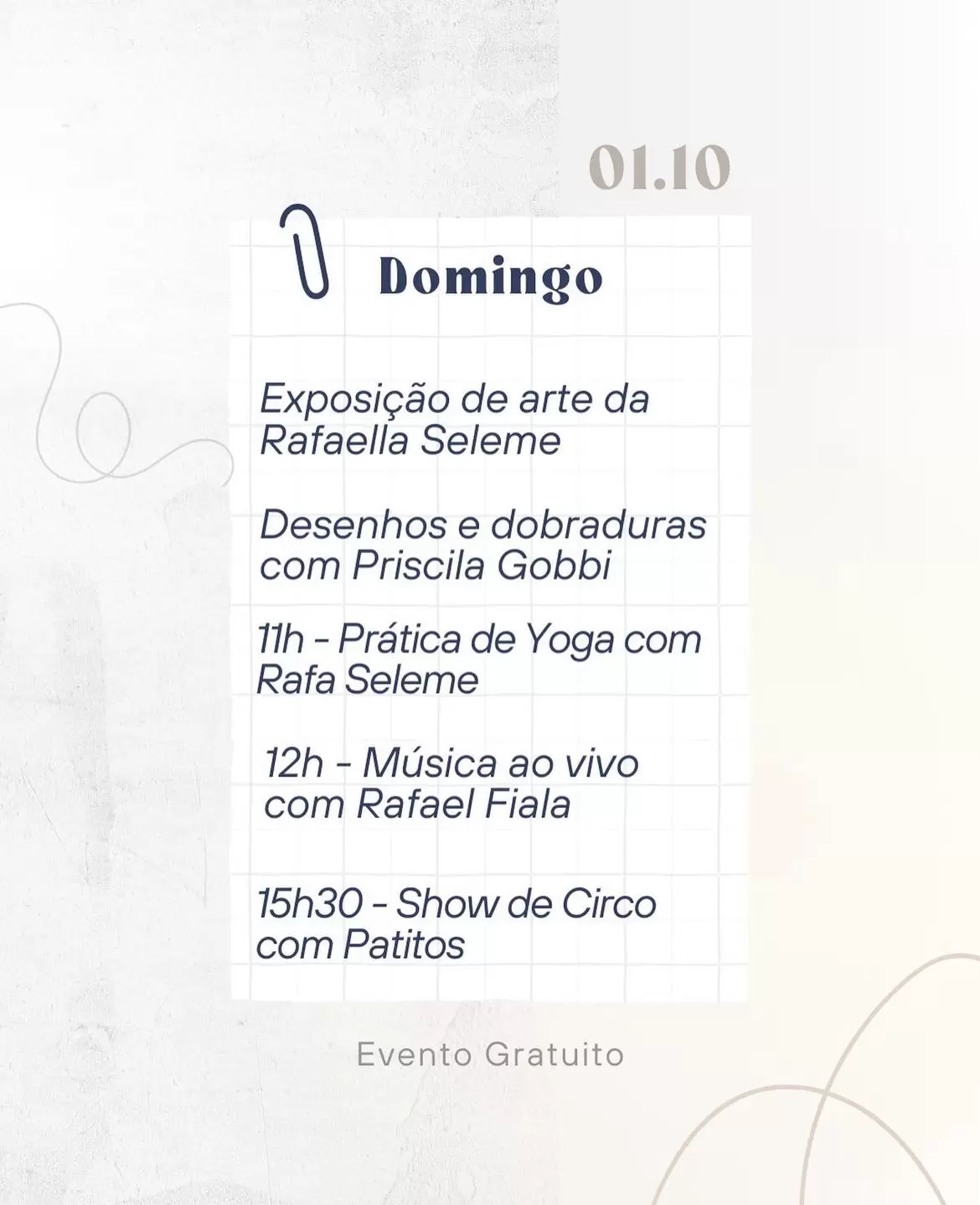 Já conhecida pela sua pluralidade, a feira vai contar ainda com exposição de arte, atrações infantis (show com o Circo com Patitos, atividade de desenhos e dobraduras), aula de yoga com Rafaella Selleme, e música ao vivo com Bruna Nogueira no sábado e com Rafael Fiala no domingo.