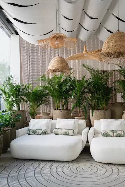Fluidez marcou a composição da "Varanda", nome dado ao ambiente na mostra. A paleta neutra reforça o desejo de simplicidade e aconchego, combinada a materiais como a madeira, fibras naturais e muito verde. A arquiteta se preocupou em escolher peças que podem ser utilizadas do lado de fora da casa, desde o mobiliário, tapetes, almofadas e cortinas.