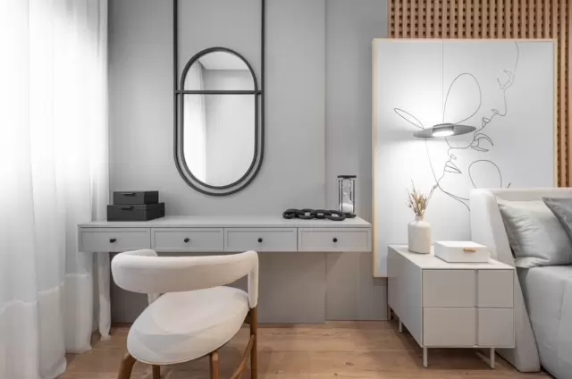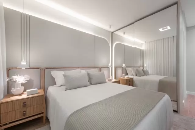 O apartamento tem três suítes. Conta Jennifer que a suíte master tem tons de nude, bege off white, iluminação indireta para vários cenários, uma cabeceira estofada baixa contemporânea, toques de madeira, aliando a parte do conforto com rouparia de cama confortável e clara. Na suíte dois há uma atmosfera bem mais contemporânea, com tons de preto, cinza, um móvel bem versátil que é a penteadeira para estudos, que pode servir como home office. O espaço pode ser do casal, do filho, da filha ou para hóspedes. A suíte três é um quarto de solteiro com home office. Um ambiente bem versátil também, com tons de cinza claros, off white, para trazer abertura, serenidade, ideia que foi trabalhada em todo o projeto de interiores do apartamento.