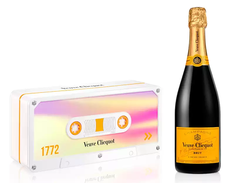Inspirada nas fitas de áudio da década de 60, a edição limitada Clicquot Tape chama atenção por sua irreverência e estilo próprio. Perfeita como objeto decorativo! Ela acompanha uma garrafa de Veuve Clicquot 750ml. (Embalagem Tape + champagne: R$ 600,00)
